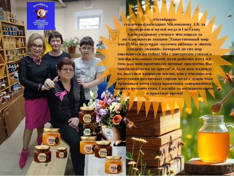 «Октябрята» сердечно благодарят Милованову Л.В. за экскурсию в музей меда и Светлану Александровну ученого-пчеловода за эксклюзивную лекцию "Таинственный мир пчел"! Мы получили «кусочек солнца» и «поток сладких знаний», который до сих пор ощущаются на губах! Мы с интересом узнали о жизни пчелиных семей, пути рабочих пчел и о том, как они производят ценные продукты. Вы "посеяли семена мудрости" и дали нам надежду на долгую и здоровую жизнь, как у пчеловодов. Дегустация различных сортов меда с душистым травяным чаем стала приятным завершением нашего путешествия. Спасибо за познавательное и приятное время!